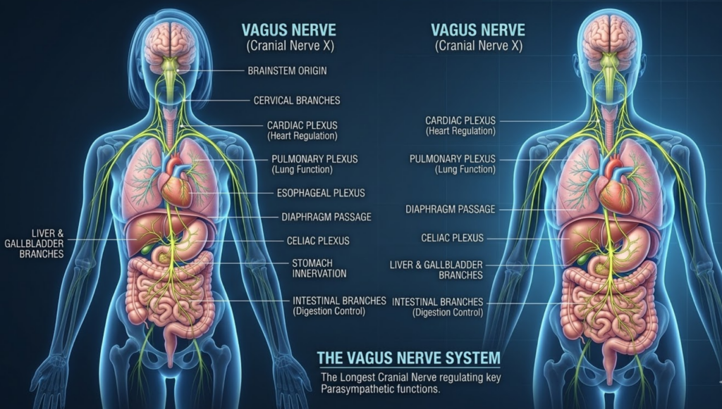 • Regulating Pain: By gently stimulating the Vagus nerve (particularly around the neck and behind the ear), we help the body naturally regulate pain perception.